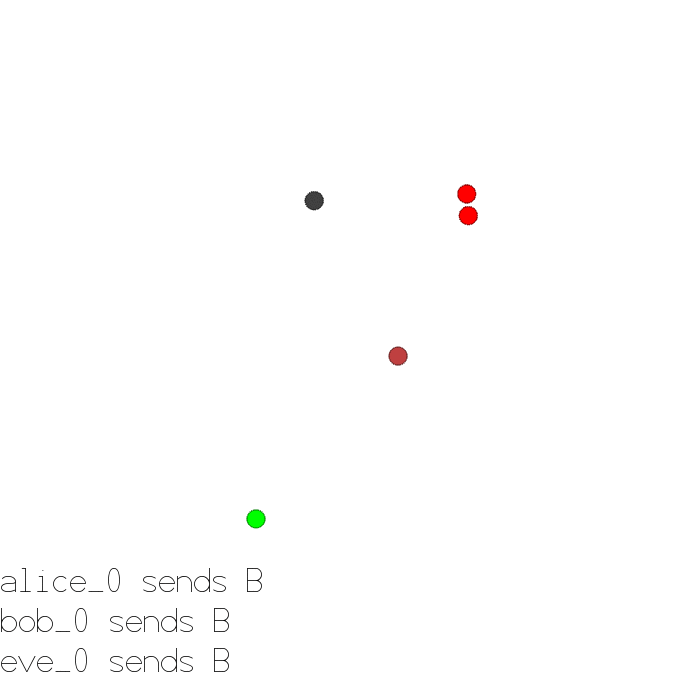 Rendering displays the scene in a window that automatically grows if agents wander beyond its border. Communication is rendered at the bottom of the scene. The render() method also returns the pixel map of the rendered area.