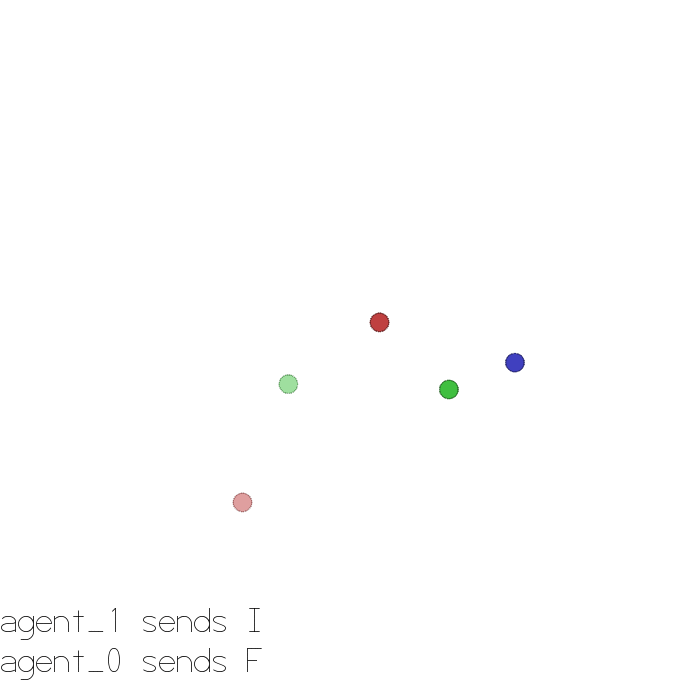 Visibility: When an agent is visible to a another agent, that other agent’s observation contains the first agent’s relative position (and in Simple World Comm and Simple Tag, the first agent’s velocity). If an agent is temporarily hidden (only possible in Simple World Comm) then the agent’s position and velocity is set to zero.